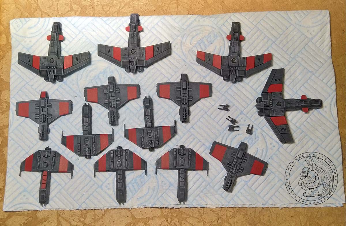 As I wanted to add more variety and to highlight the leaders of the flights, I gave them a slightly different design. I was sticking with the same colour scheme, but these fighters have an extra red stripe added, either on their wings or on their fuselages.