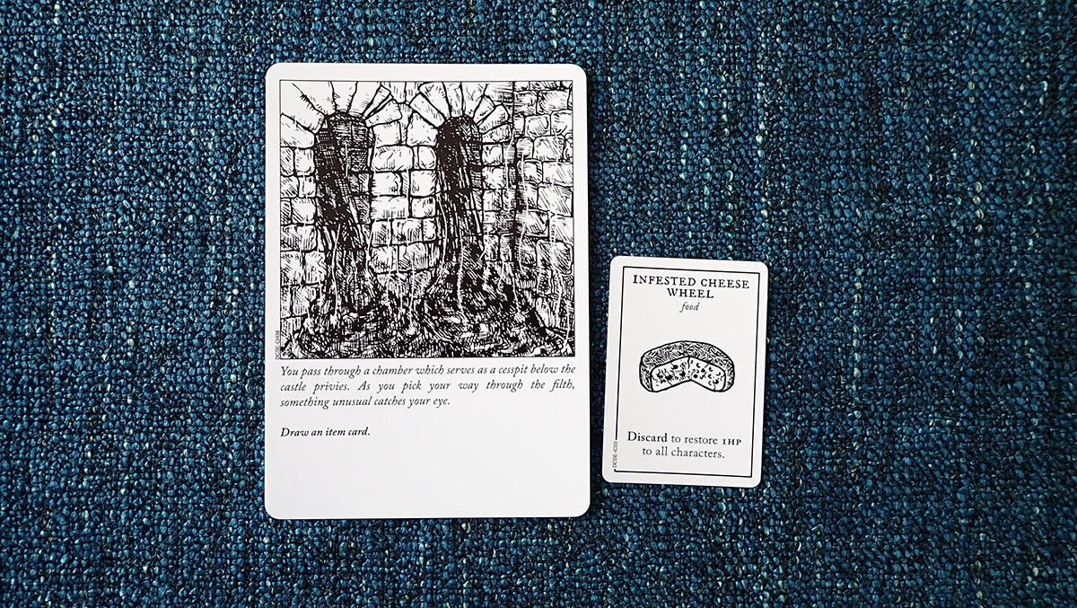 Whether you play solo or with a group, every playable character comes with a card that shows the character’s perks – Might, Cunning and Wisdom – and a unique character die. There are no special abilities and level-ups, which is probably the price to pay for the simplicity of the gameplay but it matches the dark, low fantasy ambience of the game: you are not heroes, but innocent prisoners who try to escape from this dark castle.